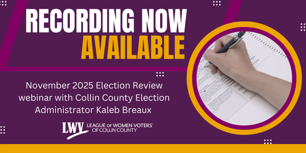 On Tuesday, December 9, 2025, the League of Women Voters of Collin County hosted a webinar with Kaleb Breaux, Collin County Election Administrator, reviewing the November 2025 election.